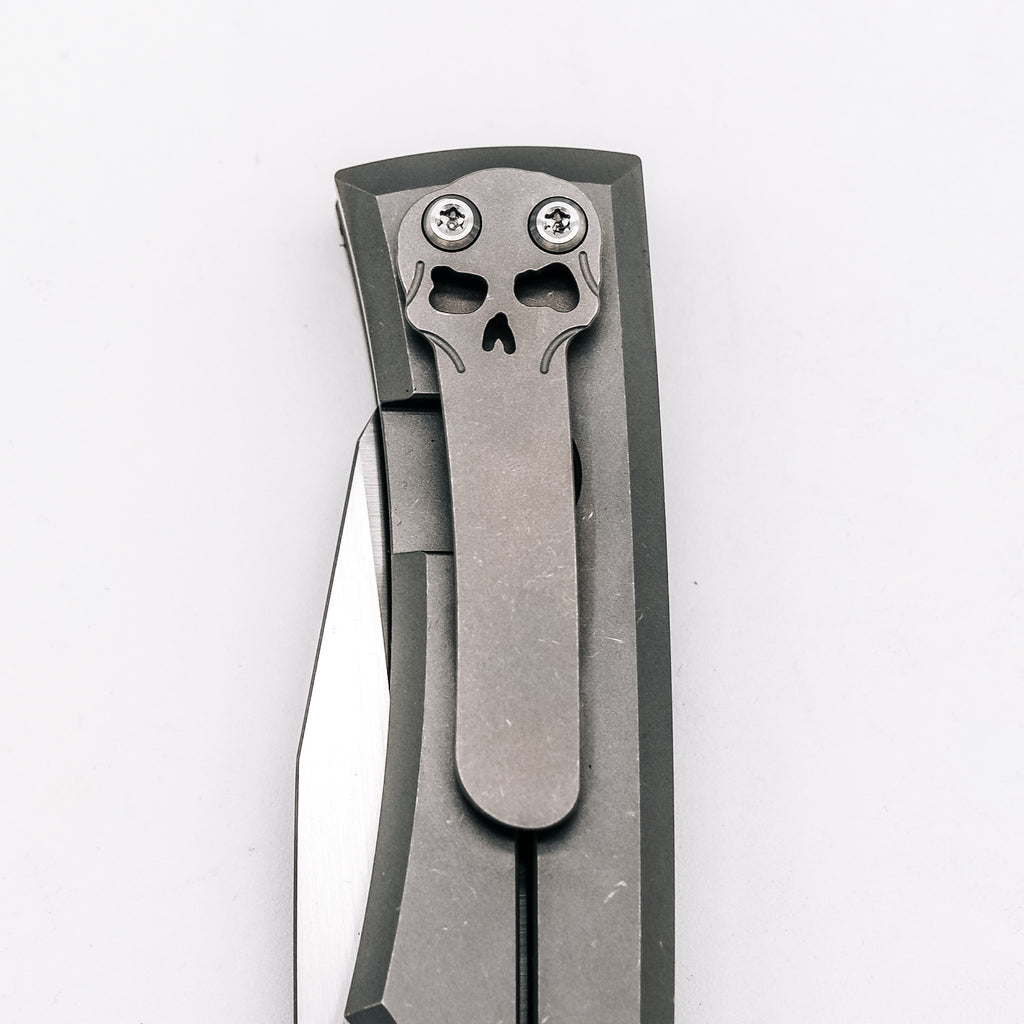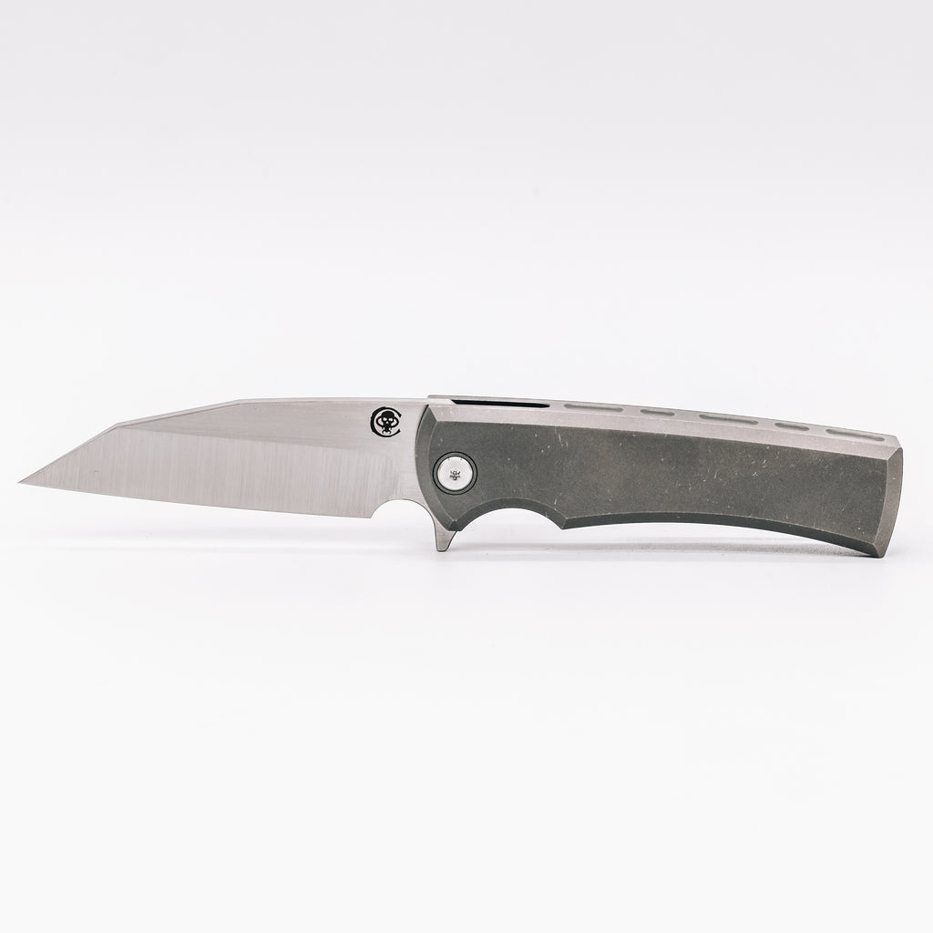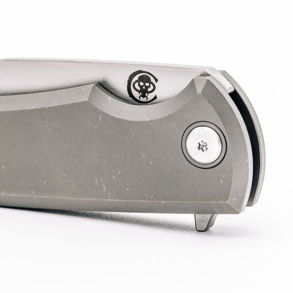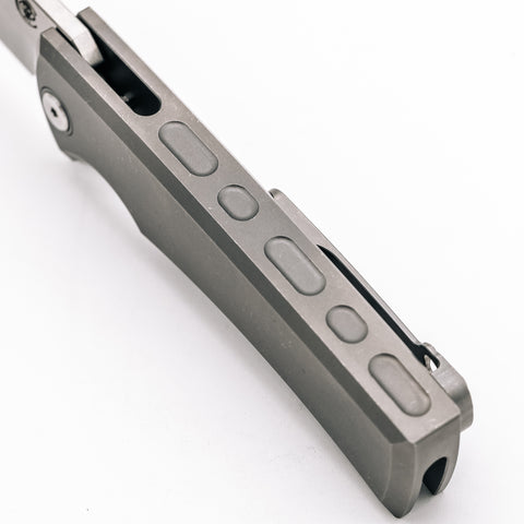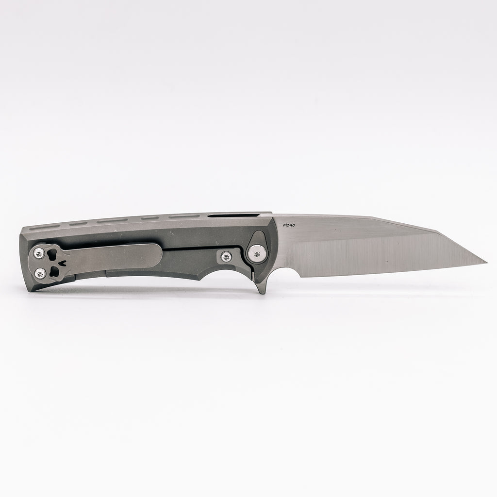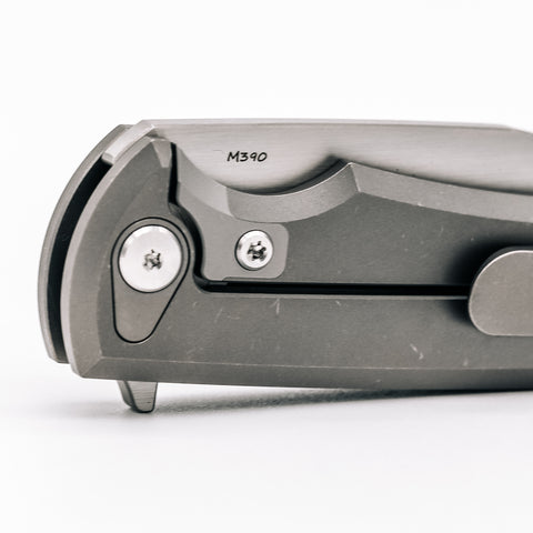 This model features a satin M390 blade and stonewashed titanium body.