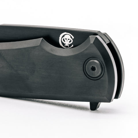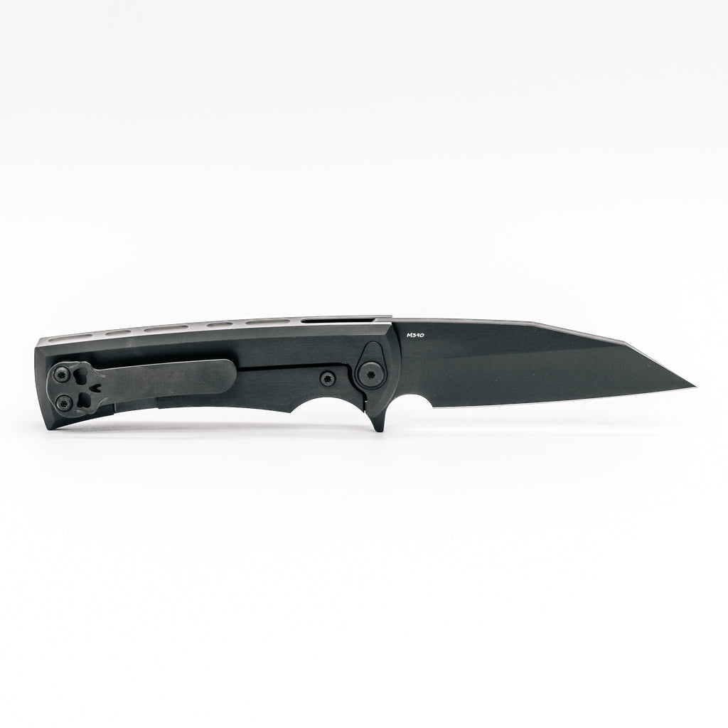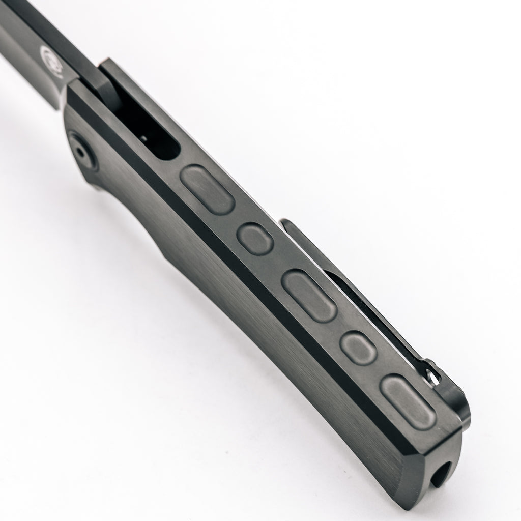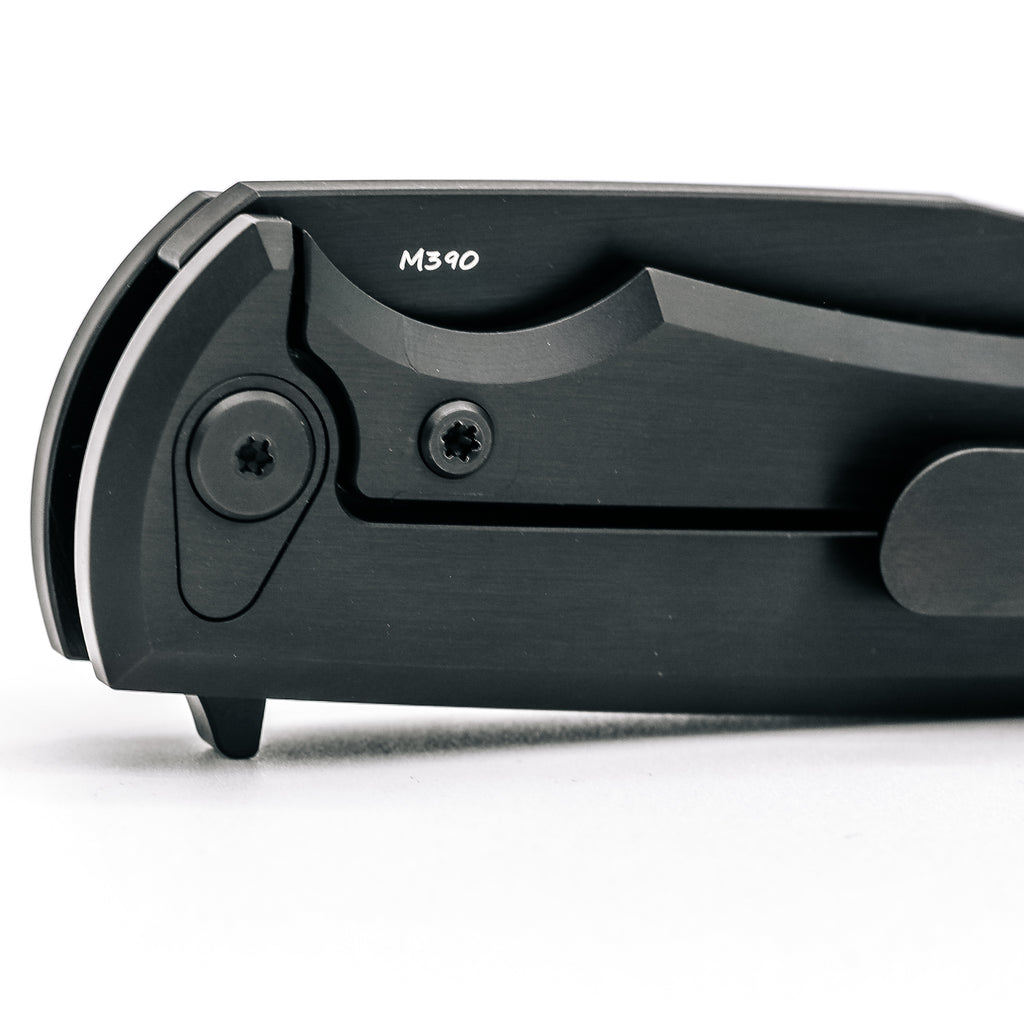 This model features a stonewashed PVD M390 blade with satin flats and a stonewashed PVD titanium stonewashed body and clip with satin flats.