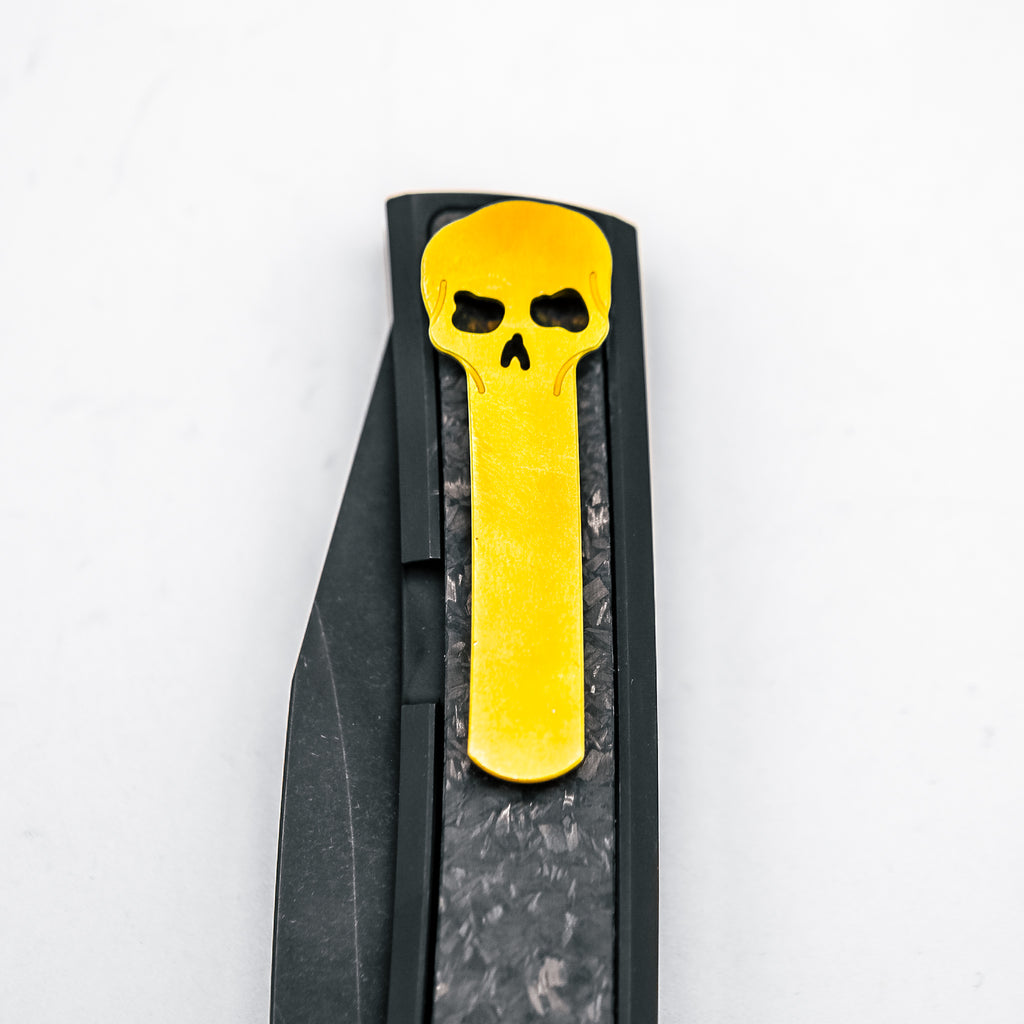 Introducing the Chaves Knives Exclusive Magnetic Integral Scapegoat 229. One of five new variations we are introducing to the Chaves line. These knives showcase our signature top-of-the-line materials. Featured in a large spearpoint blade shape, these will make a great addition in your collection. Each knife comes with a matching standard clip for those not ready to rock the skull on their pocket.